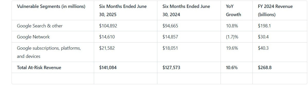 The legal proceedings target the vast majority of Alphabet's revenue. The Google Search, Network (Ad Tech), and Subscriptions (Google Play) segments collectively represent the core of the company's financial engine. The scale of this exposure is substantial, with these segments continuing to grow even as legal risks mount.