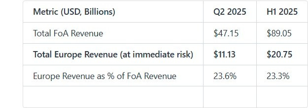 The entire FoA segment, which accounts for over 99% of company revenue, is targeted by the FTC. More immediately, the European portion of that revenue is vulnerable to regulatory changes. Europe accounted for nearly a quarter of Meta's core FoA revenue in the first half of 2025.