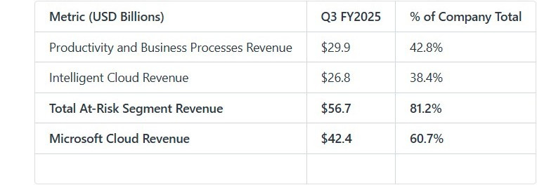 The scrutiny targets Microsoft's two largest and most profitable segments: Productivity and Business Processes and Intelligent Cloud. Together, these segments accounted for 81% of total revenue and 89% of total operating income in Q3 FY25, making any remedy highly material. The "Microsoft Cloud" revenue metric, which aggregates the key at-risk services, reached $42.4 billion in the last quarter.
